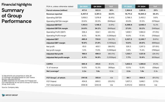 Skorygowane EBITDA wyniosło 4,1 mld zł (poprawiło się o 12 proc.) zaś wydatki inwestycyjne sięgnęły 1,8 mld zł i były o 31 proc. większe niż rok wcześniej. Niemal 70% tych wydatków przeznaczono na rozbudowę europejskiej sieci automatów paczkowych, a pozostałe środki zainwestowano w projekty związane z IT oraz rozwój technologii opartej na sztucznej inteligencji.