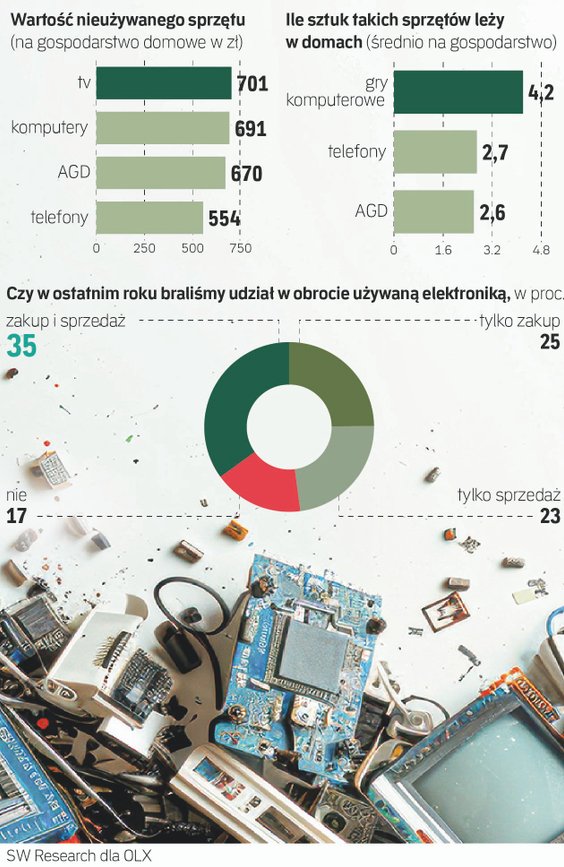 Polacy mają w domu średnio ponad 18 urządzeń elektronicznych, których już nie używają – wynika z badania SW Research dla platformy OLX. W skali kraju to ogromny i niewykorzystany potencjał: wart aż 112 mld zł, średnio 6,1 tys. zł na gospodarstwo domowe. I tylko 40 proc. badanych stawia na sprzedaż takich produktów.