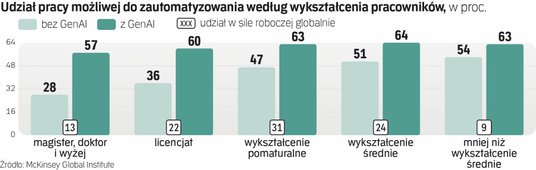 Jak wynika z raportu, w którym przeanalizowano 63 zastosowania GenAI w 850 zawodach, związana z GenAI rewolucja wywrze przemożny wpływ na rynek pracy. Zagrożeni mogą zwłaszcza czuć się wyżej opłacani specjaliści wykonujący pracę opartą na wiedzy, których pracę jeszcze do niedawna uważano za niemożliwą do zautomatyzowania.