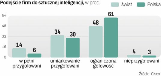Aż 97 proc. firm uważa, że w ciągu ostatnich sześciu miesięcy potrzeba wdrożenia technologii opartych na sztucznej inteligencji (AI) w tych podmiotach mocno wzrosła. Ale tylko kilkanaście procent jest gotowych na takie wdrożenie – wynika z danych Cisco. W Polsce ten odsetek jest jeszcze niższy.