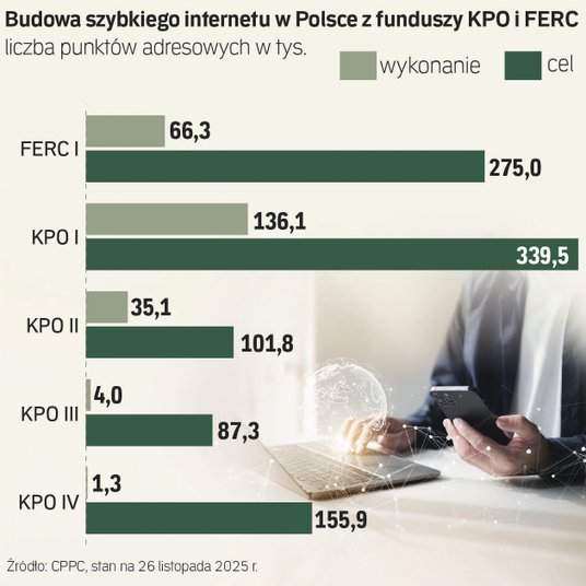 Tymczasem, jak wynika z danych CPPC, do 26 listopada firmy zbudowały i otrzymały płatność za doprowadzenie sieci dla około 178 tys. adresów. To około 18-19 proc. celu, który ma być zrealizowany w większości do końca sierpnia przyszłego roku. W tym terminie inwestorzy powinni być gotowi z rozliczeniem infrastruktury zbudowanej za pieniądze uzyskane w tegorocznym, czwartym naborze z KPO.